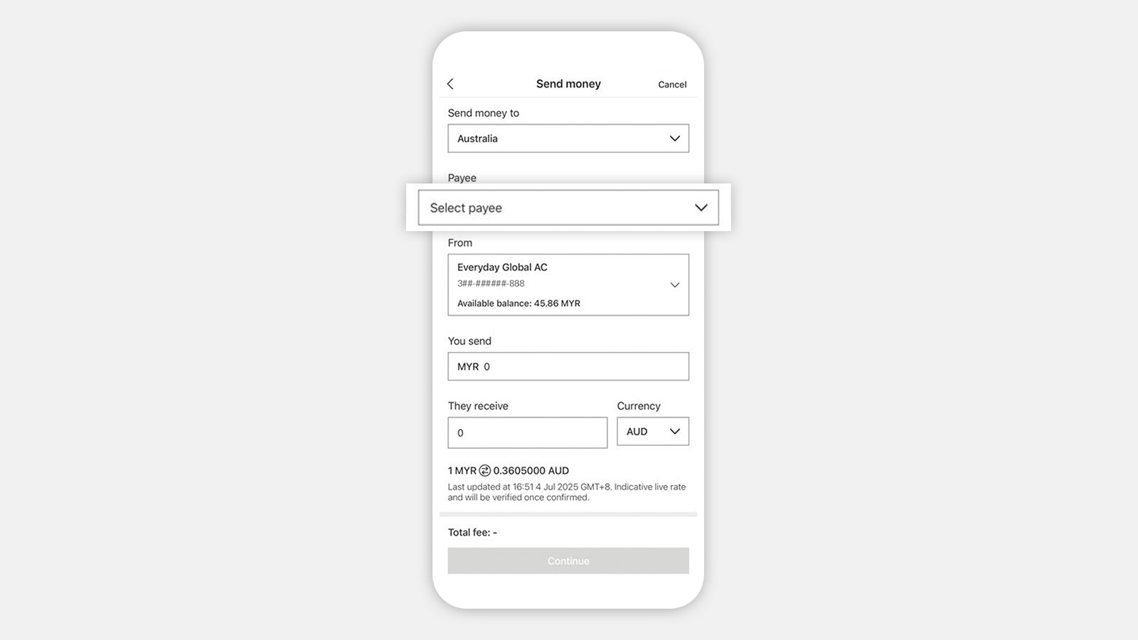 Step 2. Select the supported country or territory you want to send money to, then 'Select payee'
