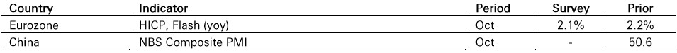 In the Eurozone, CPI inflation is expected to nudge lower to 2.1% yoy in October, from 2.2% in September. Core inflation is forecasts to moderate to 2.3% yoy in October from 2.4% yoy in September.