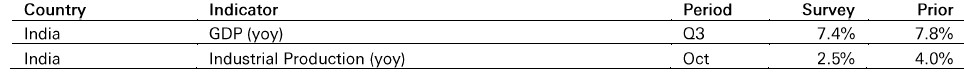 In India, real Q2FY26 GDP growth likely eased to 7.4% yoy from the previous quarter’s 7.8% yoy gain but stayed resilient. Supportive fiscal and monetary policies, including GST cuts, and easing financial regulations helped offset tariff headwinds. Industrial production growth may have slowed to 2.5% yoy in October, from 4.0% in September.