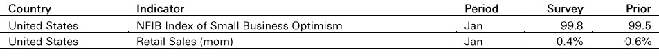 In the US, the small business sentiment index is expected to remain stable after improving in late 2025, while hiring intentions remain low. Retail sales growth should slow to 0.4% mom in January, from 0.6% mom in December.