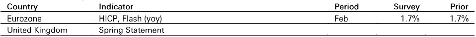 The UK Spring forecast will provide an update on growth and public finances. Fiscal measures will be unveiled in the Autumn Budget.