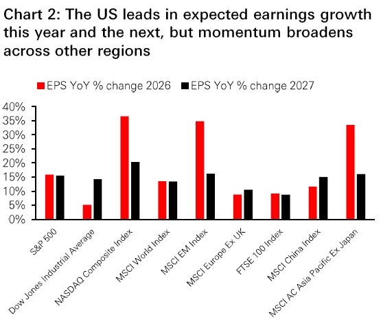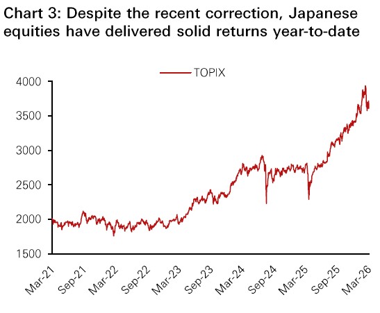 • The outlook for Asia is mixed. India and some emerging markets are sensitive to oil prices, while South Korea benefits from AI-driven growth, and energy reserves provide an added advantage to China. In Japan, fiscal expansion, wage growth and corporate governance reforms should help offset higher energy costs. As only a limited portion of Europe’s energy supply is sourced from the Middle East, the risk of severe disruption is reduced, though growth expectations have moderated but opportunities remain in the materials, industrials, communications, financials and utilities sectors.