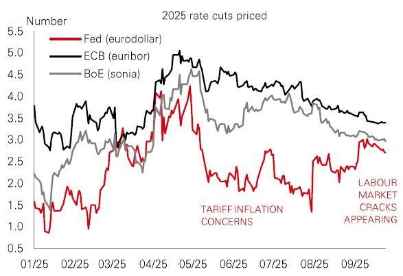 There were no major surprises in the recent volley of interest rate decisions from major central banks. The US Federal Reserve restarted its easing cycle, while the Bank of England (BoE) and the Bank of Japan (BoJ) – like the European Central Bank (ECB) a few weeks earlier – kept policy on hold. But the decisions – and accompanying commentary – revealed diverging views on the outlook, and the near-term path for rates. In the US, new FOMC member Stephen Miran was the lone dissenter (favouring a 0.5% cut) in an otherwise unanimous vote for a 0.25% cut (to 4.00-4.25%) on labour market weakness. Despite elevated inflation, the market is pricing two more 0.25% US cuts by year-end, and two in 2026. Elsewhere, the BoE has been divided since the summer on the risks of elevated inflation and weak growth, with further UK cuts not now expected until 2026. A bigger surprise was at the BoJ, where the prior assumption of there being no rush to tighten policy was dashed by two dissenting votes, which put a rate hike this year back into play. |