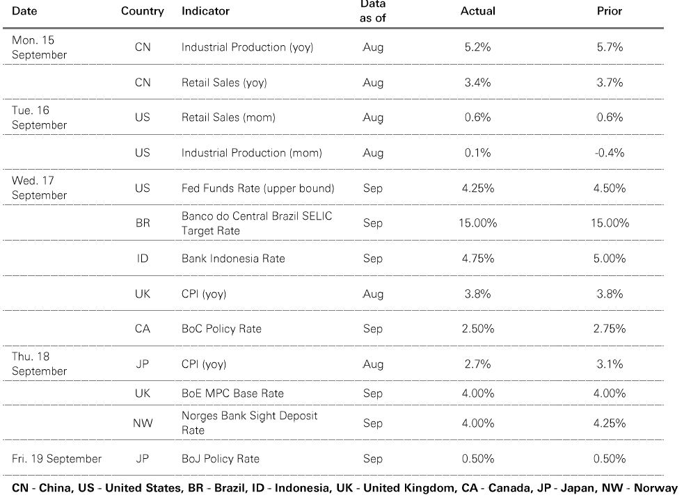 Source: HSBC Asset Management. Data as at 7.30am UK time 19 September 2025. For informational purposes only and should not be construed as a recommendation to invest in the specific country, product, strategy, sector or security. Any views expressed were held at the time of preparation and are subject to change without notice. Any forecast, projection or target where provided is indicative only and is not guaranteed in any way.