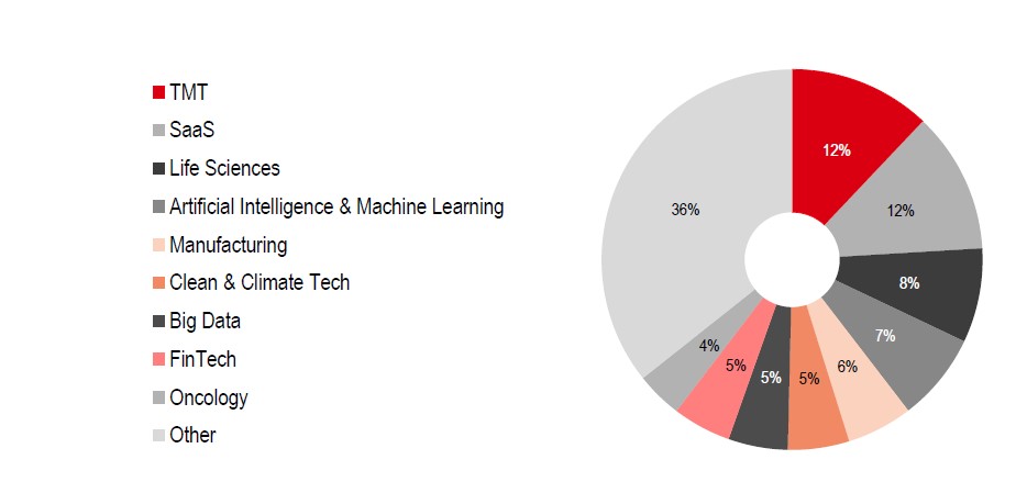 Our analysis of the VC market shows that climate and clean tech represents 5% of VC capital invested in 2024, ranking as the 6th largest category after technology, media and technology (TMT), Software as a Service (SaaS) and AI (Chart 1). When we consider VC deal volume, climate and clean tech climbs up the rankings, representing 7% and the third largest segment. This suggests that, while overall capital invested is comparatively lower, the sector is experiencing a higher number of transactions within the broader VC market (Chart 2).