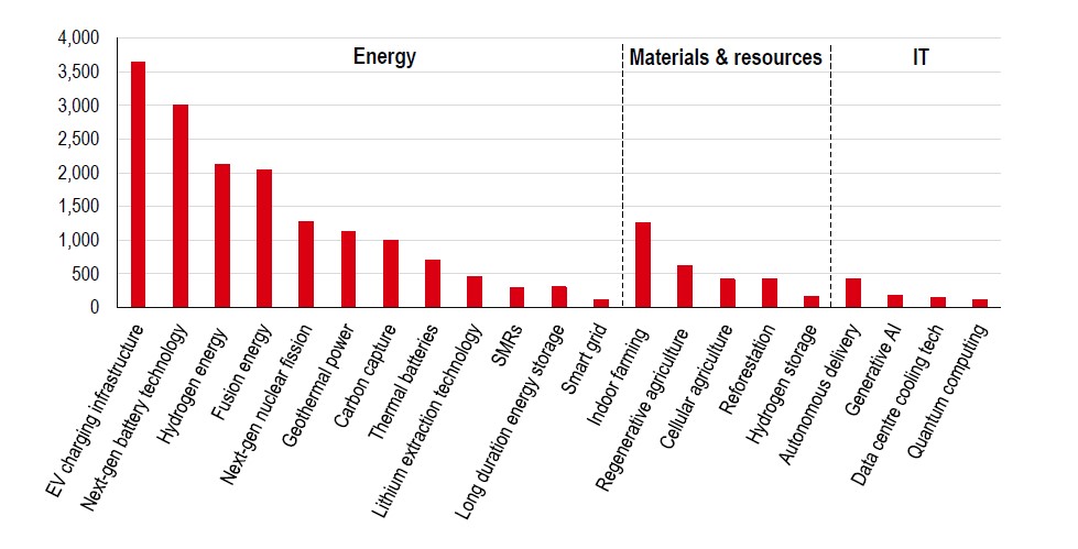 In 2024 alone, the venture capital (VC) market invested USD122bn in climate and clean tech[@why-esg-matters-05-02], with key sectors including AgTech, HealthTech, EdTech and Infrastructure. Analysing these advancements helps us understand how the landscape is evolving and where disruption will occur, while access to capital remains a key factor in the pace of net zero delivery.