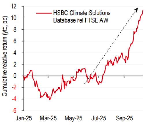 Global climate stocks in the HSBC Global Investment Research (HSBC Research) proprietary HSBC Climate Solutions Database[@why-esg-matters-04-01] (HCSD) saw a strong price performance in the third quarter of this year and have outperformed the global equity benchmark (FTSE All World Index) by 11.4 percentage points[@why-esg-matters-04-02] in 2025, as of 16 October. This follows the steady outperformance of climate stocks over the past few years, including a 15.4 percentage point gain in 2024.