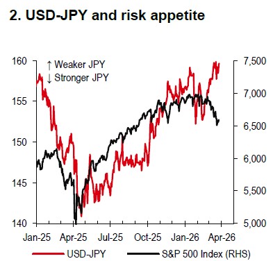 The JPY’s recent weakness is broadly understandable, reflecting terms-of-trade headwinds from higher energy prices and Japan’s sizeable net oil and gas deficit (c2.7% of GDP in 2025). However, the bigger risk is a shift in the JPY’s behaviour (Chart 2). This could happen if global financial conditions tighten abruptly, in addition to higher equity volatility and falling US Treasury yields. Historically, in such situations USD-JPY has declined in the majority of cases (85% of weekly observations since 2006 based on our analysis).