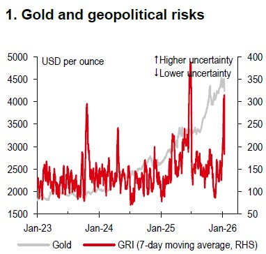 Gold rallied to new highs recently on elevated geopolitical risks (Chart 1), notably developments in Iran and Venezuela. Any escalation could further support gold prices, while a reduction in geopolitical tensions may exert downward pressure.