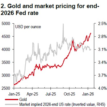 Our precious metals analyst cautions that inflows driven by “fear of missing out”’ (FOMO) may push gold prices higher over the near term, but these could reverse rapidly at new highs, resulting in greater volatility and a broad trading range. Should geopolitical risks diminish or expectations for Fed easing not materialise (Chart 2), a correction could be intensified by increased supply from mining and recycling, alongside weaker physical demand.