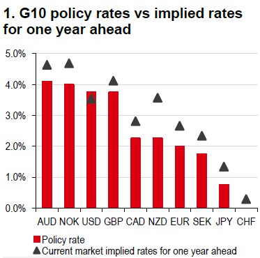 In March, many central banks chose to hold rates steady to manage heightened geopolitical uncertainty, including the Bank of Canada, the Federal Reserve (Fed), the Bank of Japan, the Swiss National Bank, the Bank of England (BoE), and the European Central Bank. Market pricing suggests that, aside from the Fed, most other G10 central banks are likely to raise rates over the next 12 months (Chart 1).