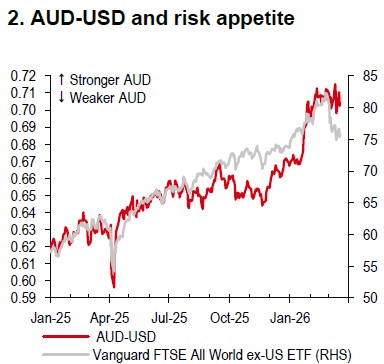 Looking ahead, the AUD is likely to remain sensitive to shifts in global risk sentiment over the near term (Chart 2). The AUD may struggle to outpace the USD, but it is likely to outpace the NZD, given Australia’s strong domestic fundamentals, including a hawkish RBA stance, commodity exposure, a modest current account deficit financed largely through foreign direct investment (FDI) and portfolio inflows, and a comparatively low debt-to-GDP ratio vs other G10 economies.