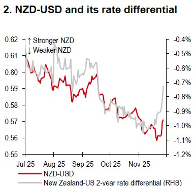 On 26 November, the Reserve Bank of New Zealand (RBNZ) cut its policy rate by 25bp to 2.25%, as widely expected. The central bank’s policy rate projection indicates a minimal additional reduction of 5bp, with the lowest rate expected by June 2026. Governor Hawkesby noted that this aligns with the rate remaining stable in 2026. The RBNZ emphasised that the significant 325bp reduction since August 2024 is bolstering demand, and the unemployment rate has peaked. Following this announcement, NZD-USD jumped, driven by rate dynamics (Chart 2).
