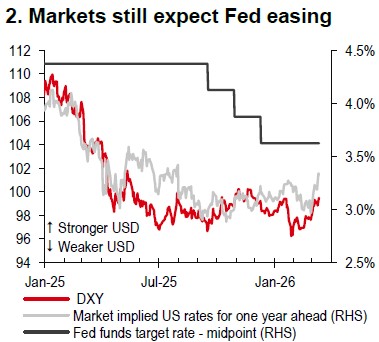 Unlike 2022, the key pillars that previously underpinned a structurally stronger USD — namely a clearly hawkish Federal Reserve (Fed) and weakening global growth — are not evident. Markets continue to price a bias towards gradual Fed easing this year (Chart 2), and leading indicators point to firmer global growth. Together, these factors can support more cyclical currencies and temper broad-based USD strength, reinforcing our central view that a de-escalation in tensions would allow the USD to resume softening. That said, risks remain skewed to the upside for the USD, if the conflict drives a sharp repricing of the Fed path into hiking territory.