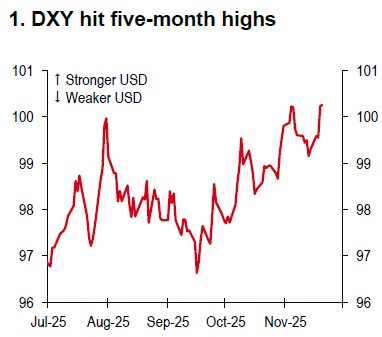 • The DXY has exceeded 100, but the USD is likely to face downward risks, in our view.