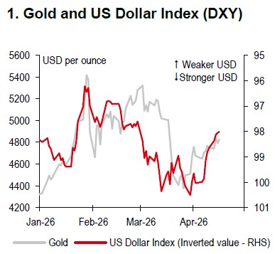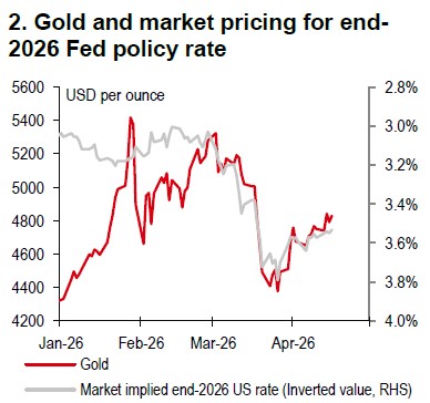 Gold has been highly volatile this year, rising to a record cUSD5,450 per ounce on 30 January before falling to a 2026 low of cUSD4,405 per ounce on 23 March, and recovering to cUSD4,800 per ounce. The pullback reflects heavy liquidation amid USD strength (Chart 1), higher US yields, elevated oil prices, weaker equities, alongside the ongoing Middle East conflict. Since the escalation, markets have priced out at least 25bp of expected easing from the Federal Reserve (Fed) by end-2026 (Chart 2), which is also a headwind for gold.