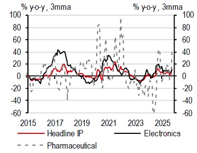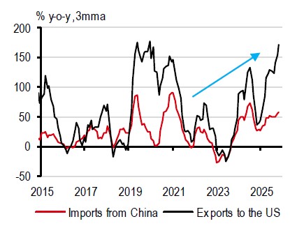 Similar to other tech-exposed economies, Vietnam has also benefitted from surging AI-driven demand. In particular, its electronics exports to the US alone jumped 150% y-o-y on a three-month moving-average (3mma) basis, pushing Vietnam’s total exports to the US up by 30% y-o-y.