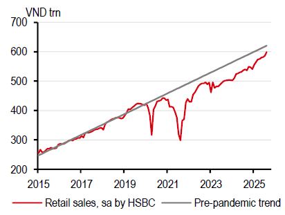 But it’s not just frontloading, 2Q growth is broad-based. The services sector saw strong performance, given decent growth in externally-oriented trade services as well as tourism-related sectors. The trend is also corroborated in retail sales, with the gap between the actual outturn and the pre-pandemic trend narrowing to 6%. Vietnam also saw the fastest tourism recovery in ASEAN.