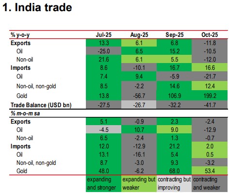 Export drag continues. Exports to the US contracted in y-o-y terms for a second consecutive month (-12% in September, and -8.6% in October). The granular breakdown will be released in a few days; however, we can get a glimpse of the tariff drag in overall export numbers. Export of gems and jewellery, leather, and chemicals contracted (in line with the trends observed in September). However, exports of exempt categories like electronics continued to rise.