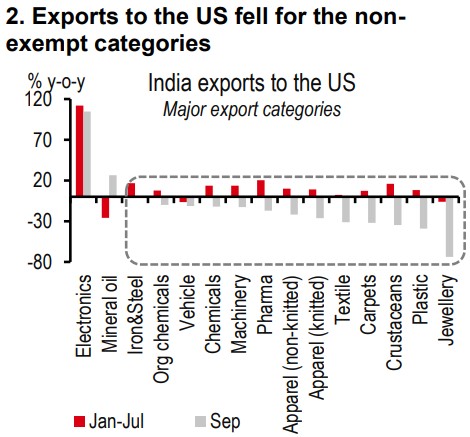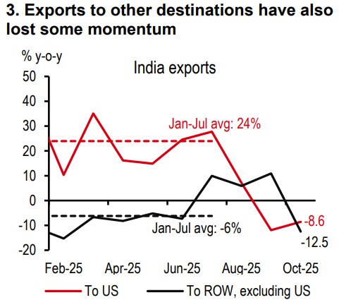 Exports to non-US destinations lost momentum. After rising 11% y-o-y in September, it slipped back into the red, in line with the trends observed in 1H25. Some of this could reflect the heightened competition of selling to non-US destinations as many countries try to diversify exports post tariff announcements. Another could be that India is not as well integrated into global supply chains and large aggregators, which assist in rerouting and tariff optimisation.
