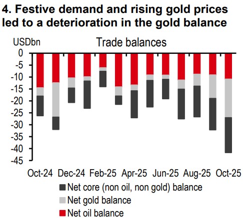 Current account deficit for 4Q25 is likely to settle close to 2.7% of GDP given the USD42bn deficit in October and assuming cUSD29bn goods deficit for November-December (a scenario where demand for precious metals fades). If the trade balance continues to average cUSD29bn in 1Q26 as well, then the full-year current account deficit may more than double to 1.4% of GDP (vs 0.6% in FY25).