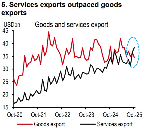 India’s services exports (USD38.5bn) outpaced goods exports (USD34.4bn) in October. After a few months of weakness, services exports bounced back (averaging cUSD37.5bn in September-October vs USD33bn in the first eight months of the year). Services trade surplus was at an all-time high of cUSD20bn.