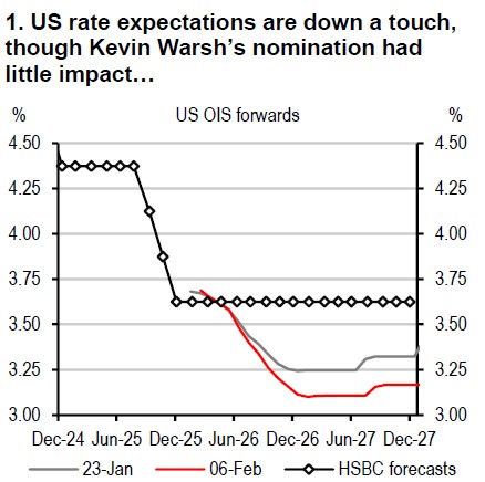 There is much discussion on potential implications for the size of the Fed’s balance sheet with Mr Warsh as Chair, but market expectations of two more Fed rate cuts in 2026 are little changed. Our forecast remains for unchanged rates given robust activity set to be bolstered further by tax cuts, inflation looking sticky, and mixed labour market signals. Other central bank action has been hugely divergent: the Reserve Bank of Australia (RBA) delivered a hawkish rate rise; Colombia a bigger-than-expected 100bp rate hike; Brazil is set to revert back to cutting in March; and the Bank of England (BoE) points to further loosening soon.