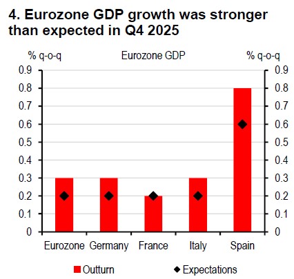 On the trade side, there has been no shortage of US tariff noise: US ambitions for Greenland – and associated warning of 25% tariffs on Europe – de-escalated post-Davos. Tariff threats against Canada and Korea, on any country selling oil to Cuba and – following recent protests – any country doing business with Iran, have all followed. But the only new US tariffs imposed so far this year are the 25% tariffs on a very narrow category of semiconductors and even those are lower than feared.