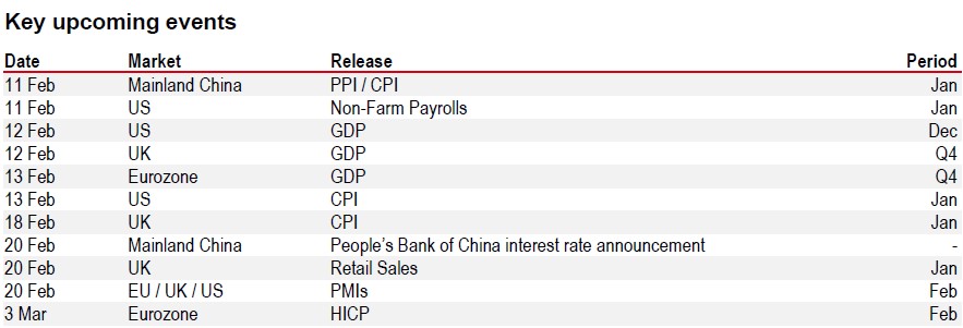 Globally, inflation is stable or slowing in many places but not all, and various input price pressures have emerged, from some key industrial metals, to memory prices, to natural gas. Global activity has stayed firm with US consumer spending, eurozone GDP and German industrial orders surprising to the upside in Q4, and global manufacturing and service sector PMIs firming in January. In Asia, mainland China GDP growth slowed in Q4, but elsewhere in the region, growth has surprised on the upside with policy generally supportive and India’s recent FY27 budget – projecting a fiscal deficit of 4.3% of GDP – represents the slowest consolidation in six years.