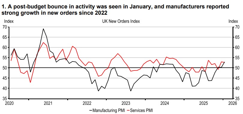 The year has started with mixed and volatile data, so it’s unclear how much underlying momentum in the economy has improved. Measures of business activity reported a sharp rebound in activity in January, most notably across services firms. However, consumer confidence ticked only 1pt higher, as improved confidence in personal finances was offset by lower expectations of the economy for this year. Those dynamics left consumers to continue to prefer saving. Elsewhere, there were signs that demand conditions are, at least, stabilising, house prices rose 0.3% m-o-m and manufacturers reported the fastest pace of new order growth since May 2022.