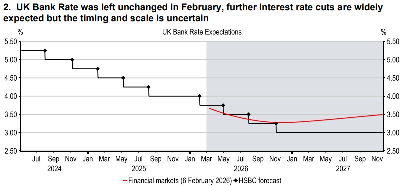 At its latest policy meeting the Bank of England’s (BoE) Monetary Policy Committee left Bank Rate unchanged at 3.75%. Four of the nine-strong Committee voted for a cut, while more broadly, policymakers appear to be gaining confidence in the disinflationary process. The prospect of lower inflation reflects weak demand in the economy, a higher rate of unemployment, and policy measures announced at the Autumn Budget. Governor Andrew Bailey, who voted for unchanged rates this month, will be key in determining the timing of the next cut, given his relatively middle ground stance. Mr Bailey suggested that he needed to see a further falls in inflation expectations alongside the expected moderation in the current inflation rate. That would help to further alleviate concerns of upside risks to inflation over the medium term. It is widely expected that the CPI inflation rate will fall to around 2% in April 2026.